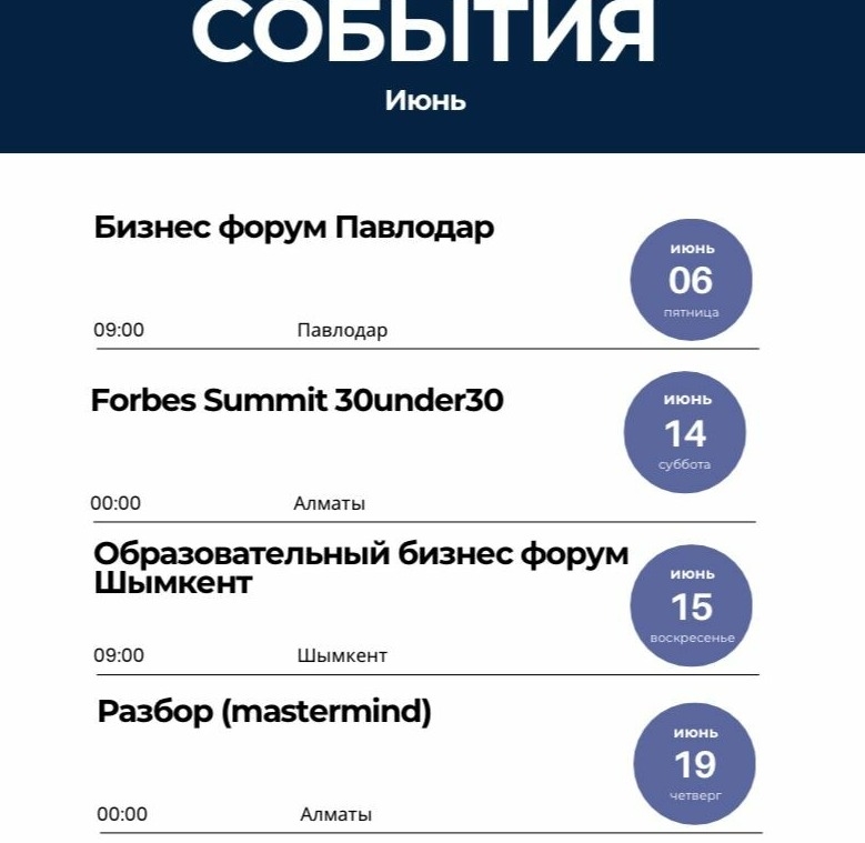 - 15 июня — образовательный бизнес-форум в Шымкенте.